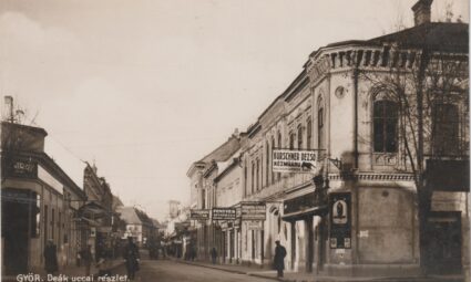Egy újabb érdekes képeslap került a gyűjteményembe. A felvétel a Deák Ferenc (ma Aradi vértanúk) utcát mutatja az Árpád út felől az 1920-as évek második feléből. Bal oldalon Mátrai István sörcsarnoka és étterme, jobb oldalon, a mai Gyermekek házában Németh Gyula szűcs és szörmeáru üzlete, hátrébb Fenyves Divatháza, Schlesinger és Hacker rövidáru kereskedése, stb. A … Bővebben: Deák uccai részlet