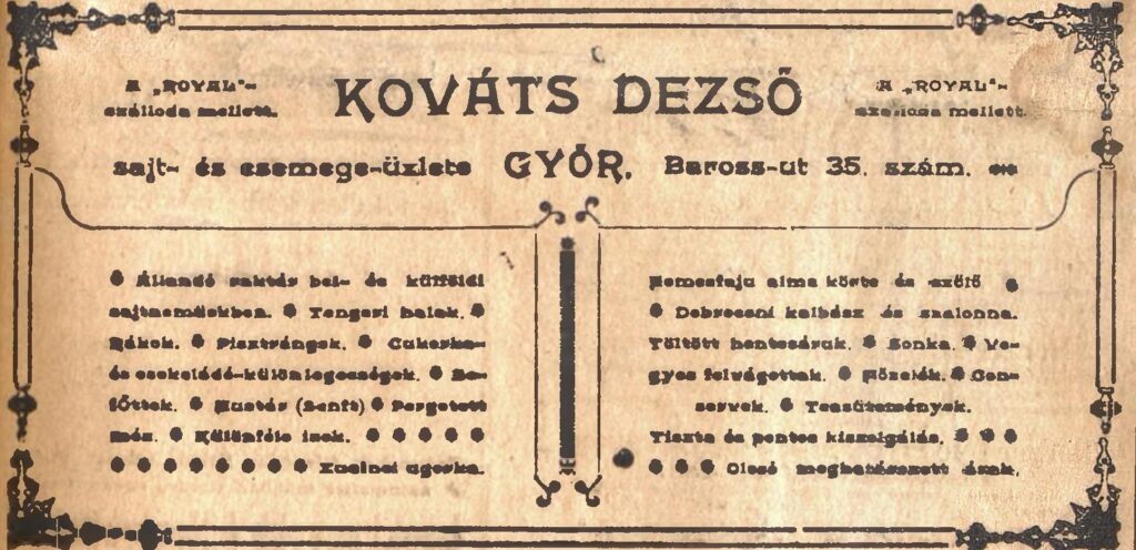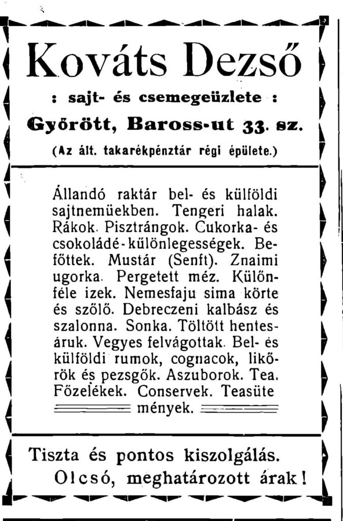 Kováts Dezső 1905-ben nyitotta meg sajt-, és csemegekereskedést a Baross út 35. szám alatt a Royal szálló mellett.