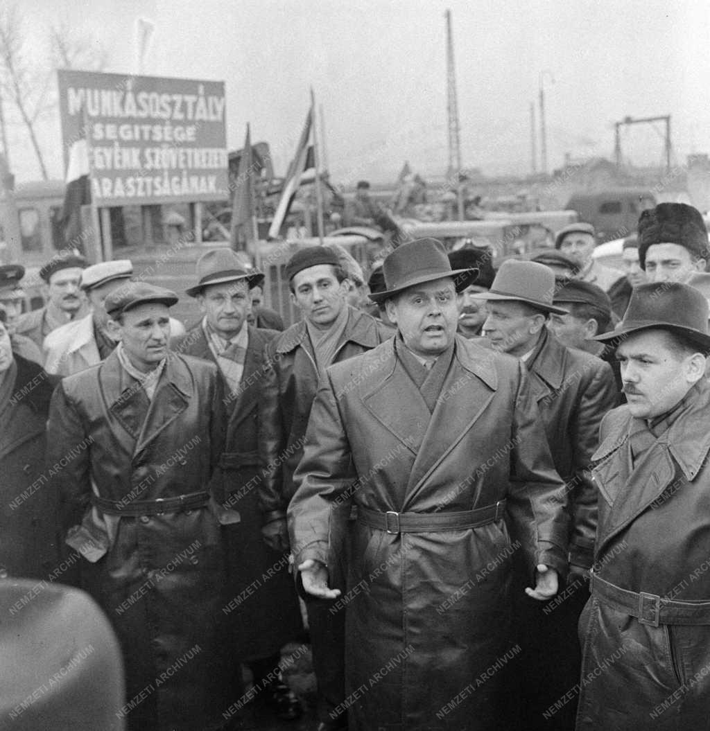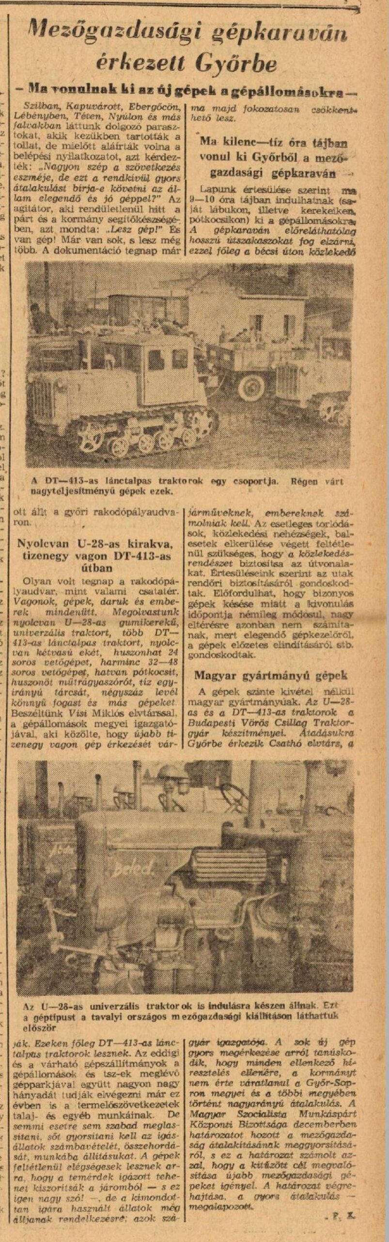 „Ilyet még nem látott Győr! A teherpályaudvar sem. Ahol a vágányokon kívül egy talpalatnyi föld van, ott gép áll. Föllobogózott lánctalpas és univerzális traktorok, pótkocsik, rajtuk vadonatúj élénkszínűre festett vetőgépek, műtrágyaszórók, ekék. Valamennyi erőgép begyújtva, indiulásra készen.” A teljes cikk alább olvasható: