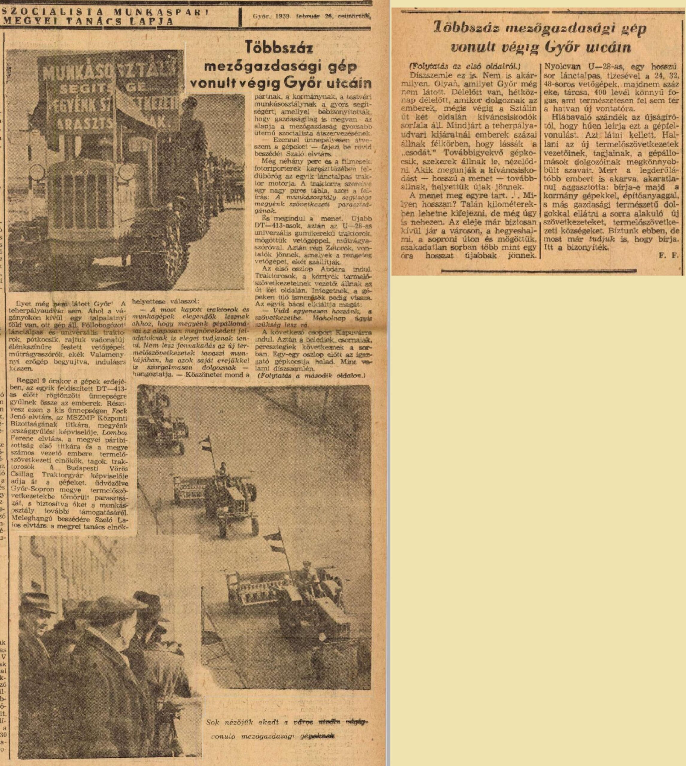 A Győr-Sopron megyei Termelőszövetkezetek részére nyolcvan U—28-as gumikerekű univerzális traktor, több DT—413-as lánctalpas traktor, nyolcvan kétvasú eke, huszonhat 24 soros vetőgép, harminc 32—48 soros vetőgép, hatvan pótkocsi, huszonöt műtrágyaszóró, tíz egy irányú tárcsa stb. érkezett a győri teherpályaudvarra 1959. február 24-én.