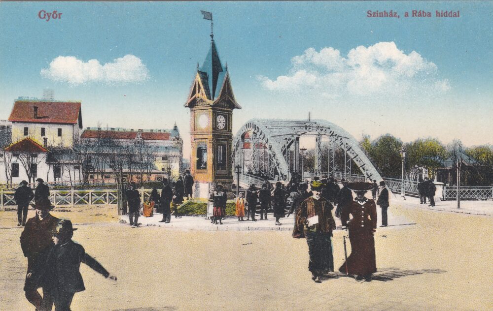 Bal oldalon a Színház a Sétatéren (Radó-sziget), középen az időjelző és a Rába híd, jobb oldalon az ún. Mádai KIOSZK épülete látszik.