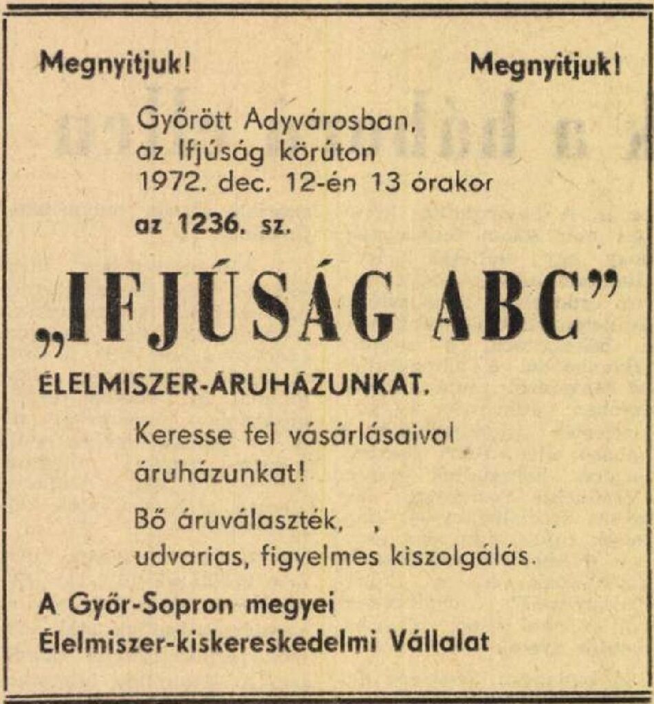 1972. december 12-én nyílt meg Adyvárosban az Ifjúság körúton az 1236. számú Ifjúság ABC.